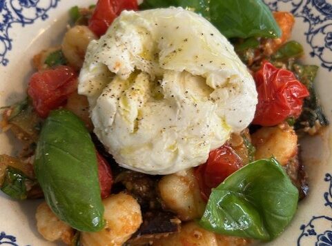 Gnocchi in een volle tomaat-basilicumsaus met geroosterde courgette, aubergine, Parmezaanse kaas en een mozzarella-bol