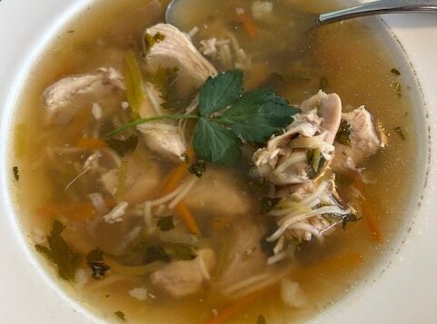 Iedereen die snotterig of grieperig is: opgelet, wij hebben heerlijke kippensoep. De bouillon heeft een hele dag opgestaan met veel kip-karkassen, daarna verse groenten, kip en een beetje vermicelli!