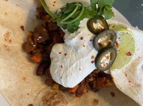 Mexicaanse burrito met pulled beef, Parmezaanse kaas en zure room