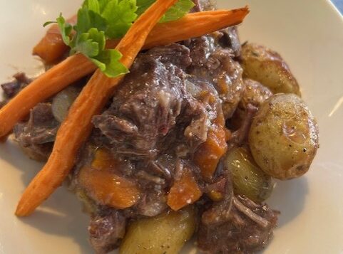 Overheerlijke Franse boeuf Bourguignon van rund en spek gestoofd in rode wijn met wortel, bleekselderij, zilverui en kastanje champignon. Met kriel uit de oven en geroosterde worteltjes