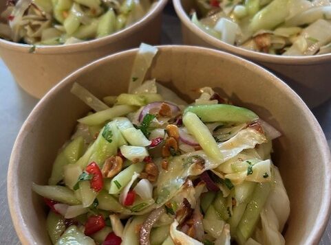 Thaise salade van geroosterde witte kool, pinda, komkommer, rode ui en een frisse sesam-limoen vinaigrette