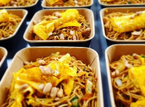 Indische vegetarische noodles met groenten, omelet en geroosterde pinda’s