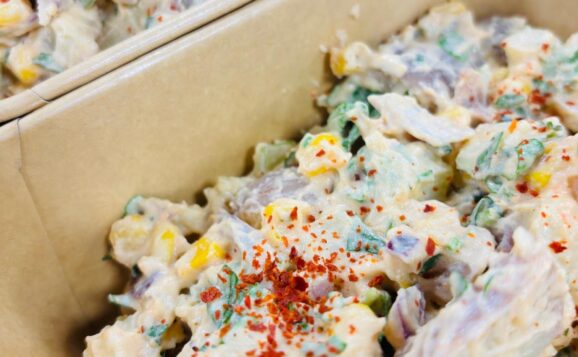 Mexicaanse aardappelsalade met mais, rode ui en koriander