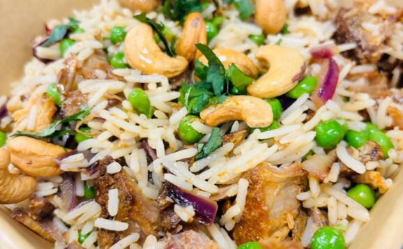 Oosterse rijst met pulled pork, doperwt, cashewnoten en koriander