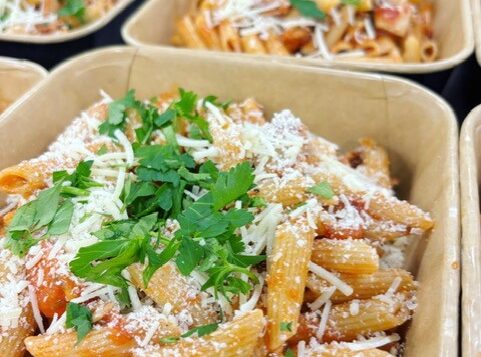 Penne met kip, kappertjes en olijven in tomatensaus met Parmezaan