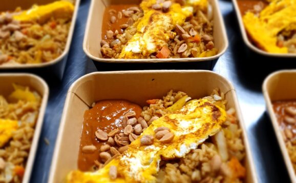 Nasi vegetarisch met satésaus, omelet en geroosterde pinda’s