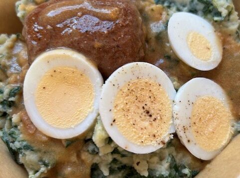 Stamppot spinazie met een eitje, jus en een heerlijke gehaktbal