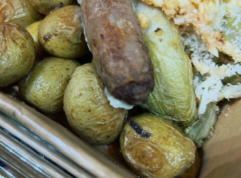 Gegratineerde witlof met krieltjes en een runder-worstje