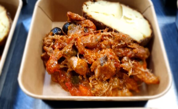 Spaanse kip met chorizo in tomatensaus met olijven en kappertjes. Met gepofte aardappel
