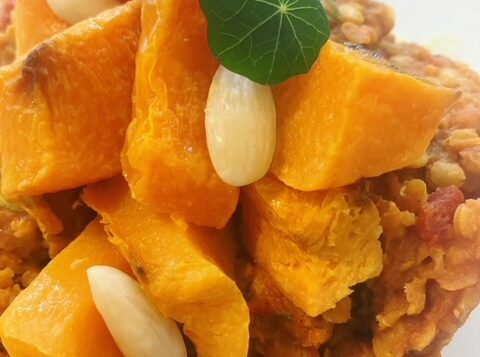 Quiche met geroosterde pompoen, gekarameliseerde ui, feta en walnoten