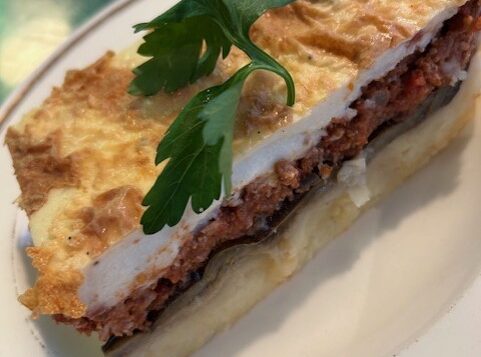 Griekse Moussaka met gehakt, aardappel, aubergine, romige bechamel en Parmezaans