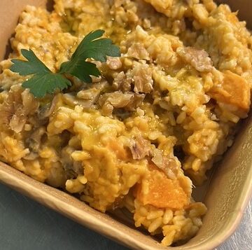 Quiche met geroosterde pompoen, gekarameliseerde ui, feta en walnoten