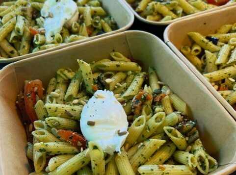 Penne met kip, tomatensaus, pesto, olijven en kappertjes